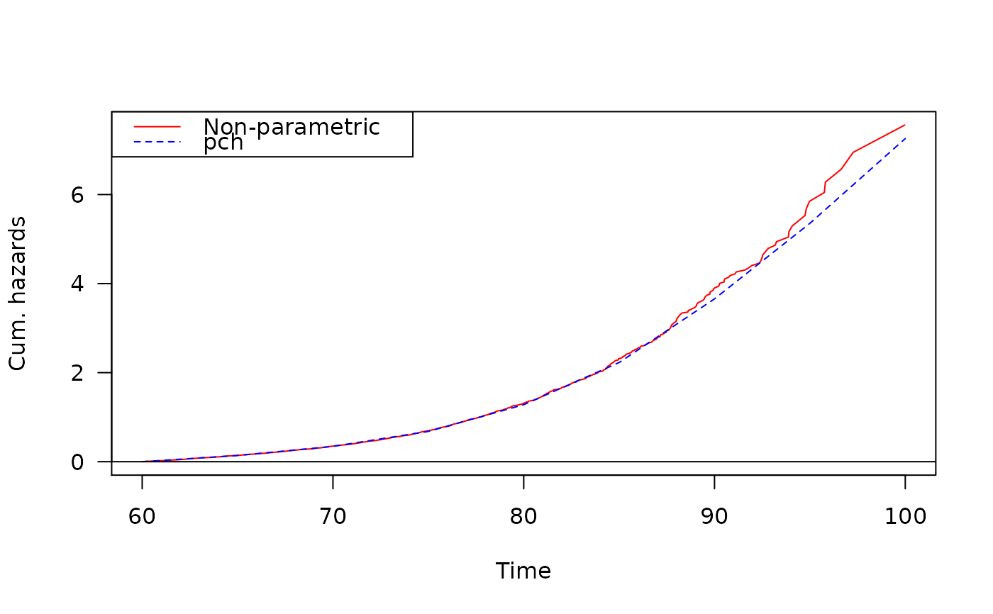 fit <- pchreg(Surv(enter, exit, event) ~ ses.50 + sex, data = oldmort, cuts = seq(60, 100, by = 5)) summary(fit)#> Covariate Mean Coef Rel.Risk S.E. LR p #> ses.50 0.3777 #> middle 0.034 0 1 (reference) #> unknown 0.419 0.015 1.015 0.131 #> upper 0.007 0.200 1.222 0.287 #> farmer 0.228 -0.091 0.913 0.134 #> lower 0.312 0.011 1.011 0.131 #> sex 0.0000 #> male 0.406 0 1 (reference) #> female 0.594 -0.210 0.811 0.049 #> #> Events 1971 #> Total time at risk 37824 #> Max. log. likelihood -7300.2 #> LR test statistic 21.17 #> Degrees of freedom 5 #> Overall p-value 0.000751976 #> #> Restricted mean survival: 14.77608 in (60, 100]